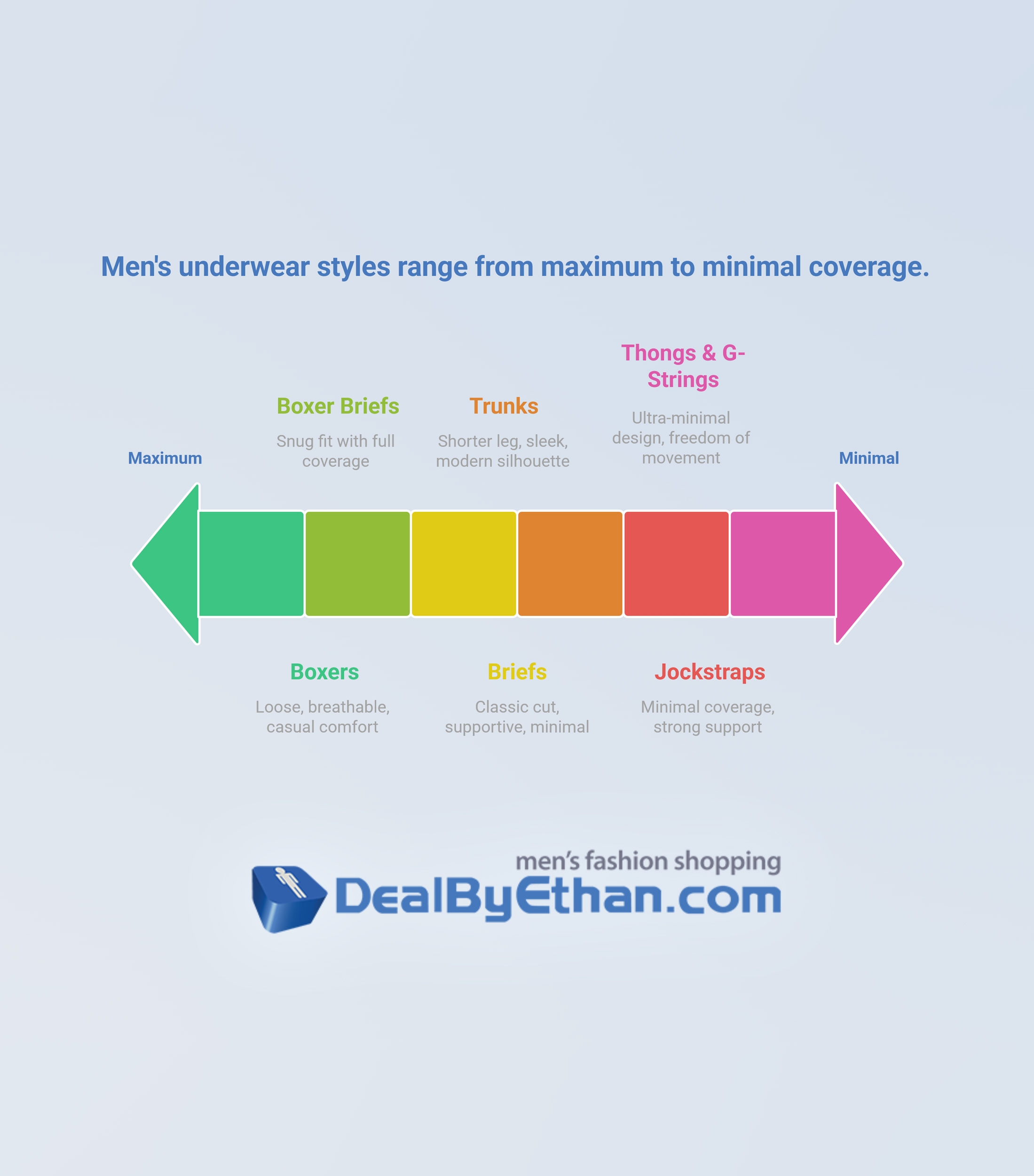 This infographic from DealByEthan.shop visually explores six core men's underwear styles—ranging from daring thongs and jockstraps to relaxed boxers. Arranged on a spectrum from minimal to full coverage, each style is paired with a bold descriptor to highlight its fit, function, and personality. Designed to empower self-expression and comfort, the graphic reflects DealByEthan.shop's commitment to inclusive fashion and confident style. Check out for more info https://www.dealbyethan.shop